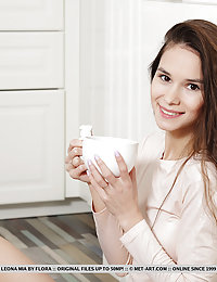 Leona Mia bares her slim body and pink pussy in the kitchen.
